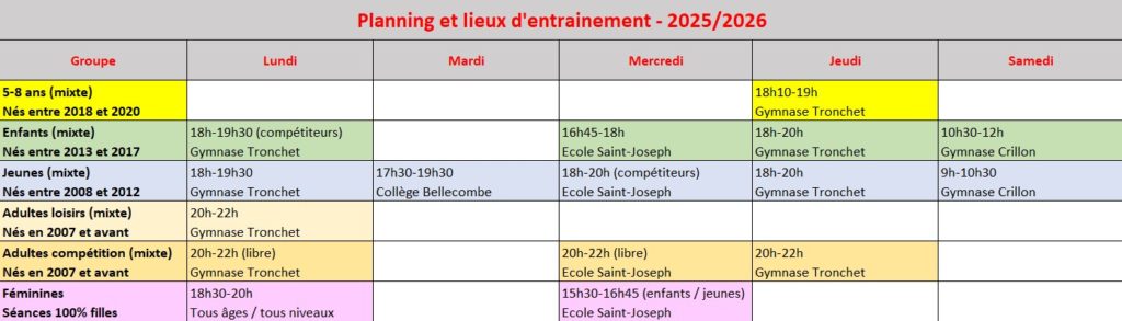 Voici le tableau actualisé des créneaux d’entrainement pour la saison 2025/2026.
